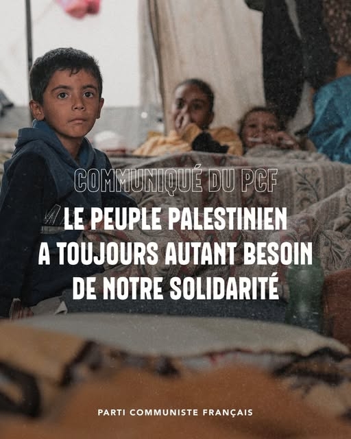 Le Parti Communiste Français réaffirme sa solidarité avec l’OLP, seule organisation légitime du peuple palestinien, avec les communistes palestiniens, avec les communistes et le camp de la paix israéliens. Seul le respect des droits nationaux du peuple palestinien assurera la paix entre les deux peuples !